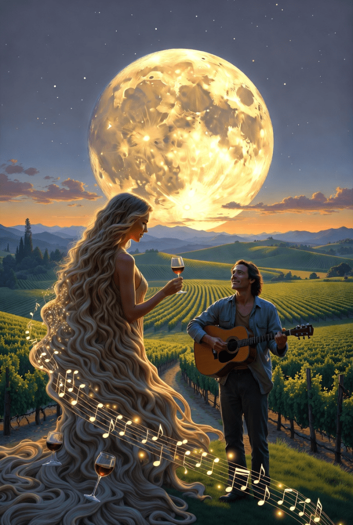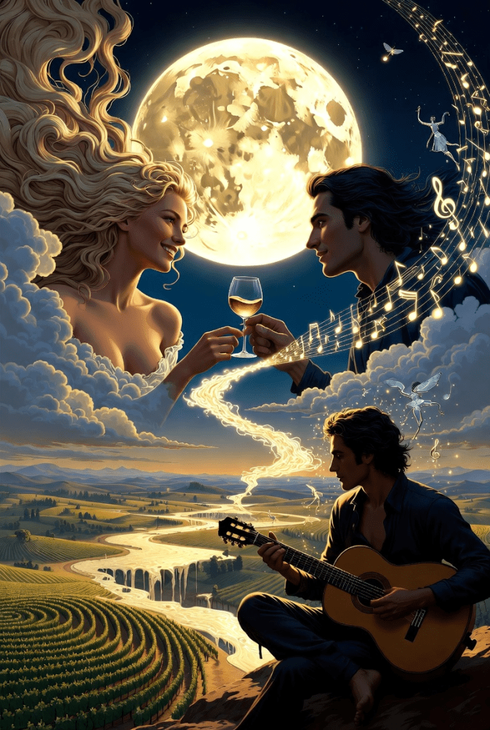 A kiss at a vineyard sunset gives courage to the man, Who was once too afraid to do what only a bold man can. Painting landscapes that belong in a lover's heart, It whispers with beauty, some loves must never part.