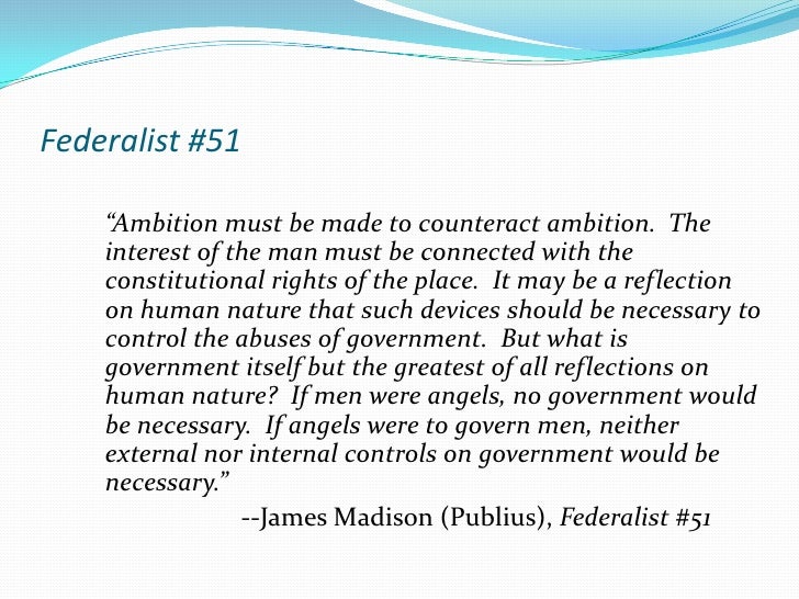 “Ambition must be made to counteract ambition. The interest of the man must be connected with the constitutional rights of the place. It may be a reflection on human nature that such devices should be necessary to control the abuses of government. What is government itself but the greatest of all reflections on human nature?” – James Madison (1788)