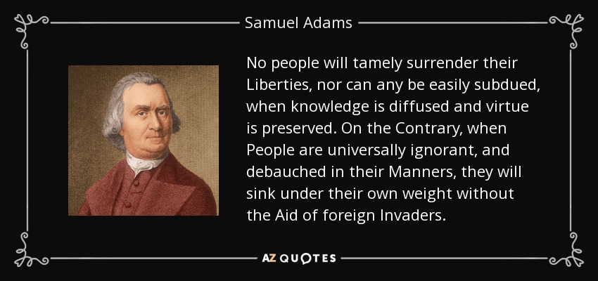 “No people will tamely surrender their Liberties, nor can any be easily subdued, when knowledge is diffused and virtue is preserved. On the contrary, when people are universally ignorant, and debauched in their manners, they will sink under their own weight without the aid of foreign invaders.” – Samuel Adams (1775)