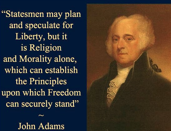 “Our Constitution was made only for a moral and religious people. … Statesmen may plan and speculate for Liberty, but it is Religion and Morality alone, which can establish the Principles upon which Freedom can securely stand. The only foundation of a free Constitution, is pure Virtue, and if this cannot be inspired into our People, in a greater Measure than they have it now, They may change their Rulers, and the forms of Government, but they will not obtain a lasting Liberty.” – John Adams
