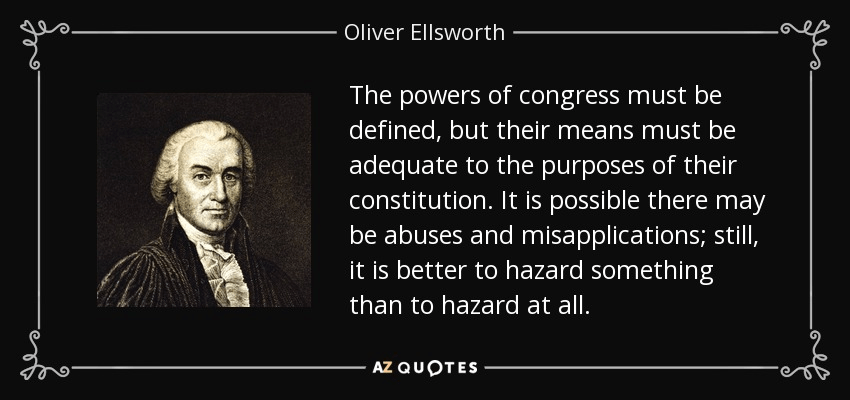 “The powers of congress must be defined, but their means must be adequate to the purposes of their constitution. It is possible there may be abuses and misapplications; still, it is better to hazard something than to hazard at all.” – Oliver Ellsworth