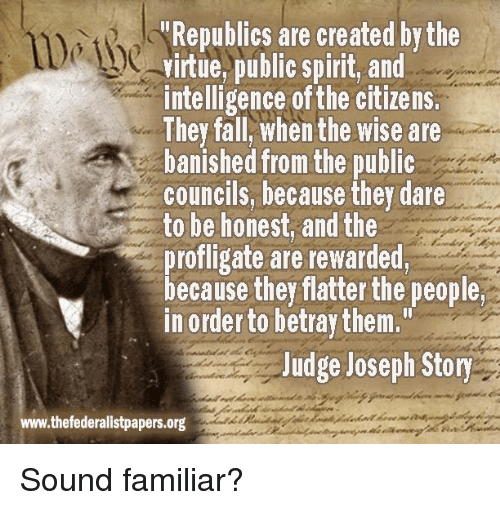 “Republics are created by the virtue, public spirit, and intelligence of the citizens. They fall, when the wise are banished from the public councils, because they dare to be honest, and the profligate are rewarded, because they flatter the people, in order to betray them.” –Joseph Story, Commentaries on the Constitution, 1833