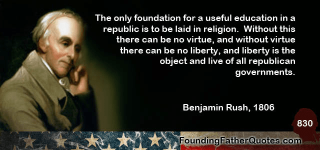 “I proceed … to inquire what mode of education we shall adopt so as to secure to the state all of the advantages that are to be derived from the proper instruction of the youth; and here I beg leave to remark that the only foundation for a useful education in a republic is to be laid on the foundation of religion. … Without this there can be no virtue, and without virtue there can be no liberty, and liberty is the object and life of all republican governments. But the religion I mean to recommend in this place is that of the New Testament” – Dr. Benjamin Rush – Dr. Benjamin Rush
