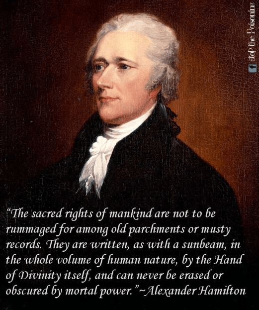 “The sacred rights of mankind are not to be rummaged for, among old parchments, or musty records. They are written, as with a sun beam, in the whole volume of human nature, by the hand of the divinity itself; and can never be erased or obscured by mortal power.” – Alexander Hamilton (1775)