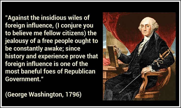“The jealousy of a free people ought to be constantly awake; since history and experience prove that foreign influence is one of the most baneful foes of Republican Government.” – George Washington (1796