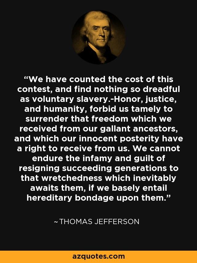 “Honor, justice, and humanity, forbid us tamely to surrender that freedom which we received from our gallant ancestors, and which our innocent posterity have a right to receive from us. We cannot endure the infamy and guilt of resigning succeeding generations to that wretchedness which inevitably awaits them if we basely entail hereditary bondage on them.” – Thomas Jefferson, Declaration of the Causes and Necessities of Taking up Arms, 1775