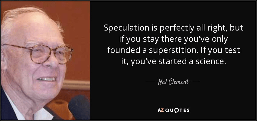 “Speculation is perfectly all right, but if you stay there you’ve only founded a superstition. If you test it, you’ve started a science.” -Hal Clement, science fiction author (30 May 1922-2003)