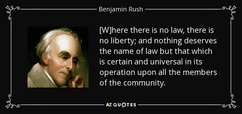 “Where there is no law, there is no liberty; and nothing deserves the name of law but that which is certain and universal in its operation upon all the members of the community.” – Benjamin Rush (1788)