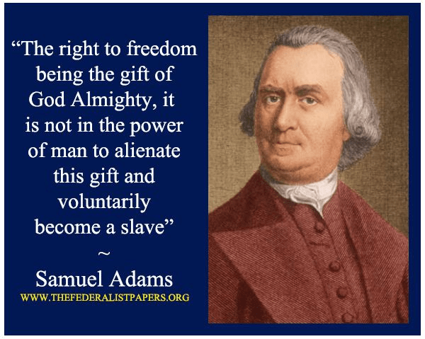 “If men through fear, fraud or mistake, should in terms renounce and give up any essential natural right, the eternal law of reason and the great end of society, would absolutely vacate such renunciation; the right to freedom being the gift of God Almighty, it is not in the power of Man to alienate this gift, and voluntarily become a slave.” – Samuel Adams (1772)