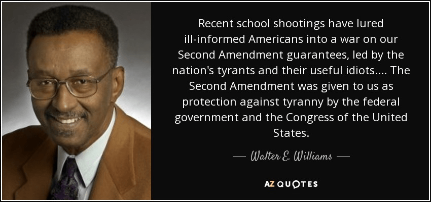 “Recent school shootings have lured ill-informed Americans into a war on our Second Amendment guarantees, led by the nation’s tyrants and their useful idiots. … The Second Amendment was given to us as protection against tyranny by the federal government and the Congress of the United States.” – Walter E. Williams (1936-2020)