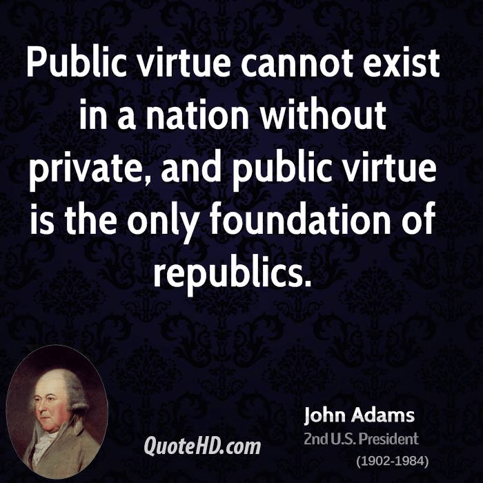 “Public virtue cannot exist in a nation without private, and public virtue is the only foundation of republics. There must be a positive passion for the public good, the public interest, honour, power and glory, established in the minds of the people, or there can be no republican government, nor any real liberty: and this public passion must be superiour to all private passions.” – John Adams, letter to Mercy Warren, 1776