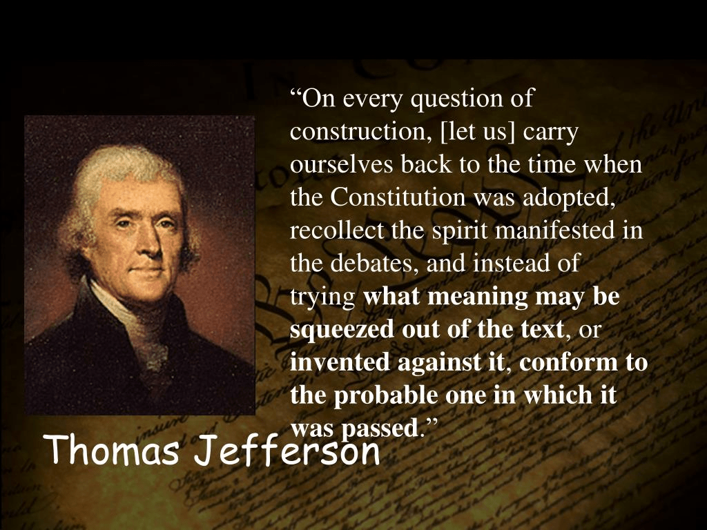 “On every question of construction carry ourselves back to the time when the Constitution was adopted, recollect the spirit manifested in the debates and instead of trying what meaning may be squeezed out of the text or invented against it, conform to the probable one in which it was passed.” – Thomas Jefferson (1823)