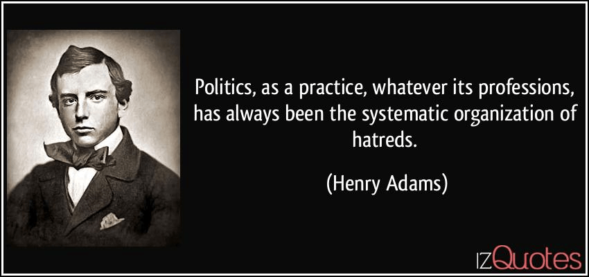 “Politics, as a practise, whatever its professions, has always been the systematic organization of hatreds.” – Henry Brooks Adams (1838-1918)
