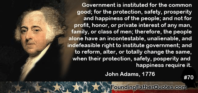 “We ought to consider what is the end of government before we determine which is the best form. Upon this point all speculative politicians will agree that the happiness of society is the end of government, as all divines and moral philosophers will agree that the happiness of the individual is the end of man.” -John Adams, Thoughts on Government, 1776