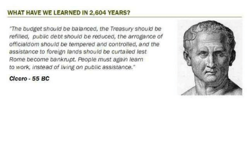 “The budget should be balanced, the Treasury should be refilled, public debt should be reduced, the arrogance of officialdom should be tempered and controlled, and the assistance to foreign lands should be curtailed lest Rome become bankrupt. People must again learn to work, instead of living on public assistance.” – Roman philosopher and statesman Marcus Tullius Cicero (106-43
