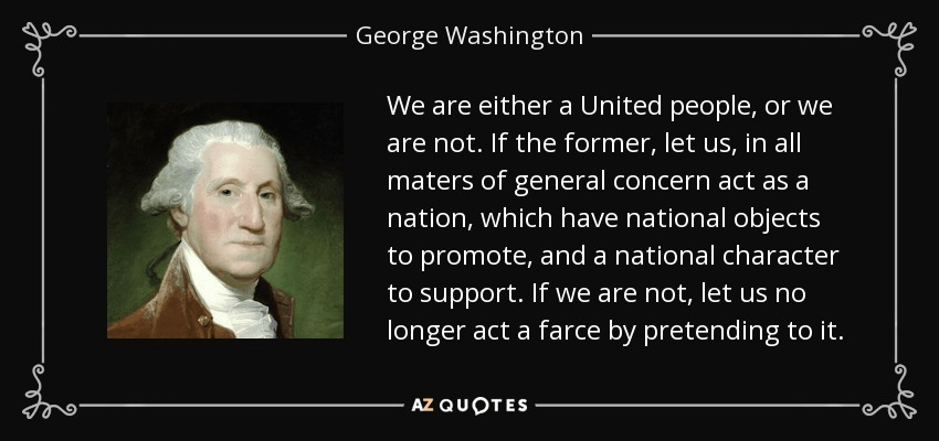 “We are either a United people, or we are not. If the former, let us, in all matters of general concern act as a nation, which have national objects to promote, and a national character to support. If we are not, let us no longer act a farce by pretending to it.” – George Washington (1785)