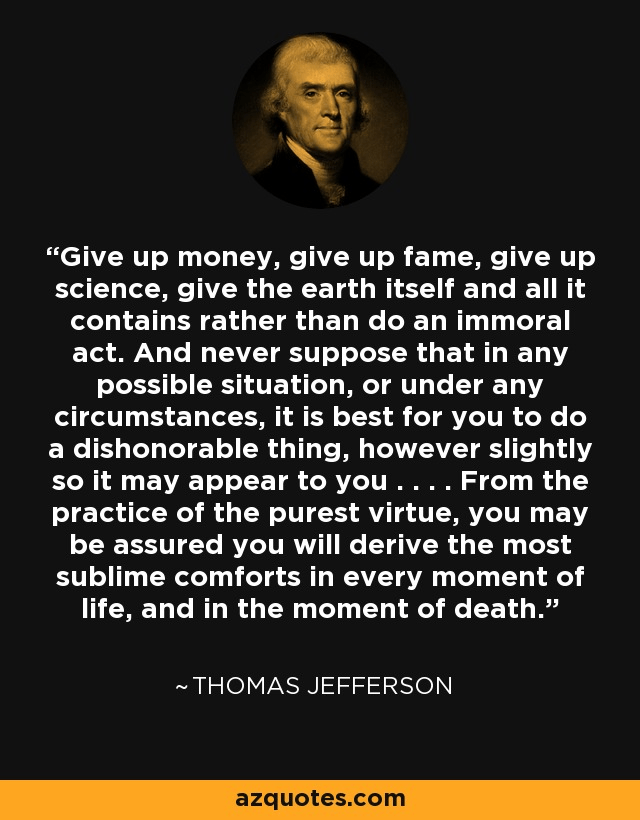 “Give up money, give up fame, give up science, give the earth itself and all it contains rather than do an immoral act. And never suppose that in any possible situation, or under any circumstances, it is best for you to do a dishonorable thing, however slightly so it may appear to you.” – Thomas Jefferson (1785)