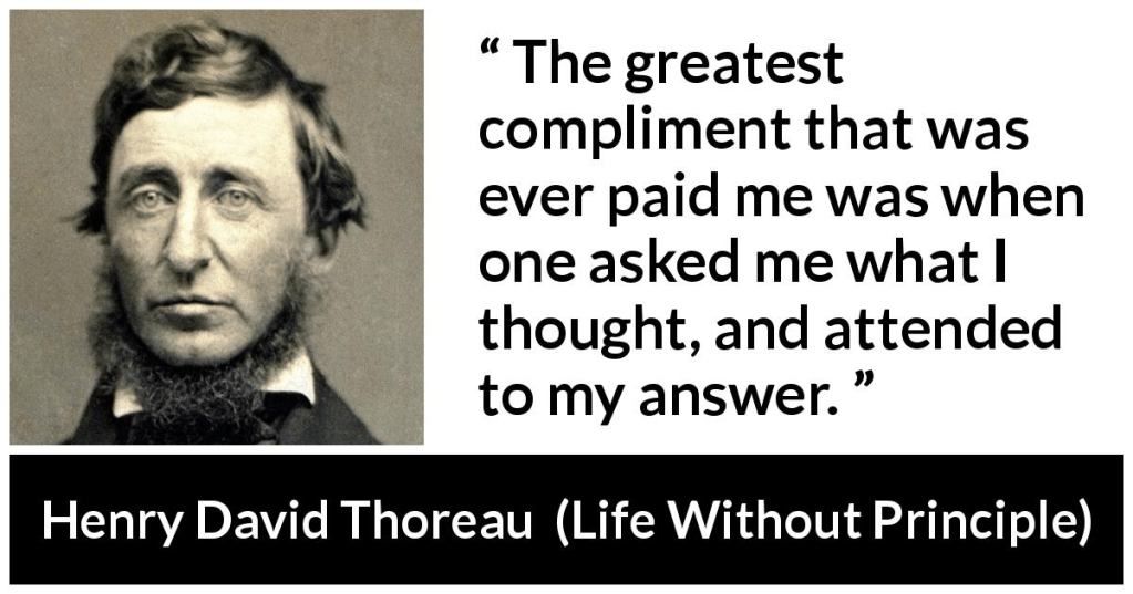 “The greatest compliment that was ever paid me was when one asked me what I thought, and attended to my answer.” – Henry David Thoreau, naturalist and author (1817-1862)