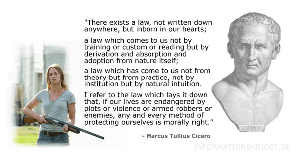 “There exists a law, not written down anywhere but inborn in our hearts; a law which comes to us not by training or custom or reading but by derivation and absorption and adoption from nature itself; a law which has come to us not from theory but from practice, not by instruction but by natural intuition. I refer to the law which lays it down that, if our lives are endangered by plots or violence or armed robbers or enemies, any and every method of protecting ourselves is morally right.” – Marcus Tullius Cicero (106-43 B.C.)