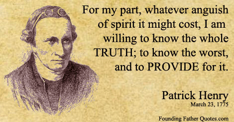“It is natural to man to indulge in the illusions of hope. We are apt to shut our eyes against a painful truth — and listen to the song of that syren, till she transforms us into beasts. Is this the part of wise men, engaged in a great and arduous struggle for liberty? Are we disposed to be of the number of those, who having eyes, see not, and having ears, hear not, the things which so nearly concern their temporal salvation? For my part, whatever anguish of spirit it might cost, I am willing to know the whole truth; to know the worst, and to provide for it.” – Patrick Henry (1775)