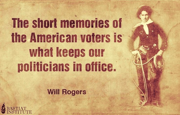 “The short memories of the American voters is what keeps our politicians in office.” – Will Rogers (1879-1935)