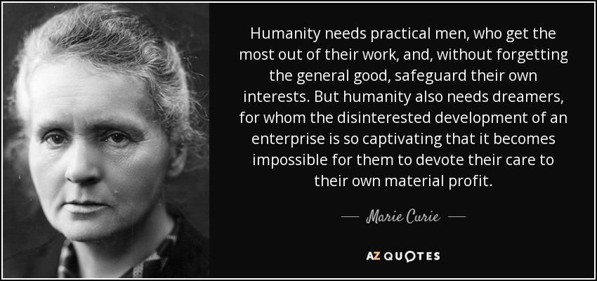 “Humanity also needs dreamers, for whom the disinterested development of an enterprise is so captivating that it becomes impossible for them to devote their care to their own material profit. Without doubt, these dreamers do not deserve wealth, because they do not desire it. Even so, a well-organized society should assure to such workers the efficient means of accomplishing their task, in a life freed from material care and freely consecrated to research.” -Marie Curie, scientist, Nobel laureate (1867-1934)