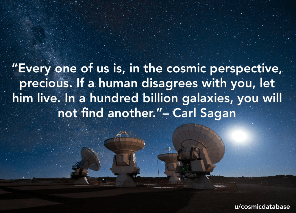 “Every one of us is precious in the cosmic perspective. If a human disagrees with you, let him live. In a hundred billion galaxies, you will not find another.” – Carl Sagan, astronomer and writer (9 Nov 1934-1996)
