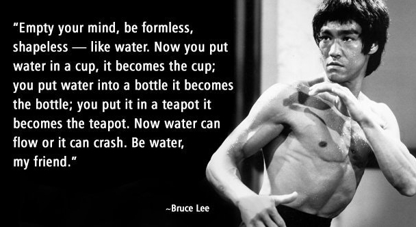 “Empty your mind, be formless. Shapeless, like water. If you put water into a cup, it becomes the cup. You put water into a bottle and it becomes the bottle. You put it in a teapot, it becomes the teapot. Now, water can flow or it can crash. Be water, my friend.” – Bruce Lee