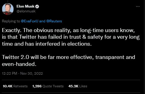 “The obvious reality, as long-time users know, is that Twitter has failed in trust & safety for a very long time and has interfered in elections. Twitter 2.0 will be far more effective, transparent and even-handed.” – Elon Musk