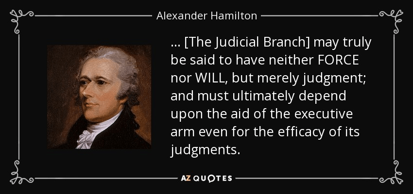 “[The judicial Branch] may truly be said to have neither FORCE nor WILL, but merely judgment; and must ultimately depend upon the aid of the executive arm even for the efficacy of its judgments.” -Alexander Hamilton (1788)