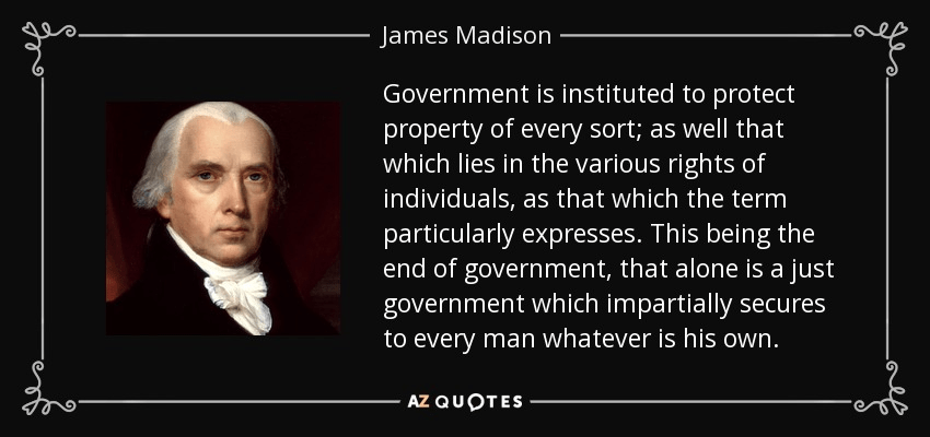 “Government is instituted to protect property of every sort; as well that which lies in the various rights of individuals, as that which the term particularly expresses.” – James Madison (1792)
