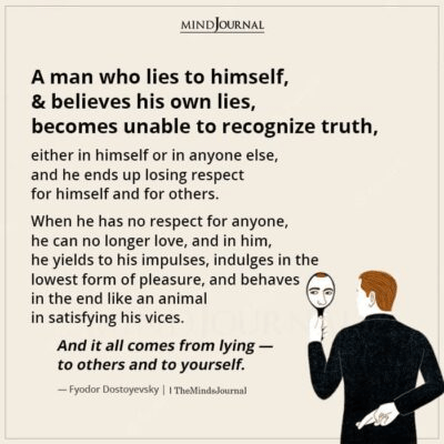 “A man who lies to himself, and believes his own lies, becomes unable to recognize truth, either in himself or in anyone else, and he ends up losing respect for himself and for others.” -Fyodor Dostoevsky, novelist (1821-1881)