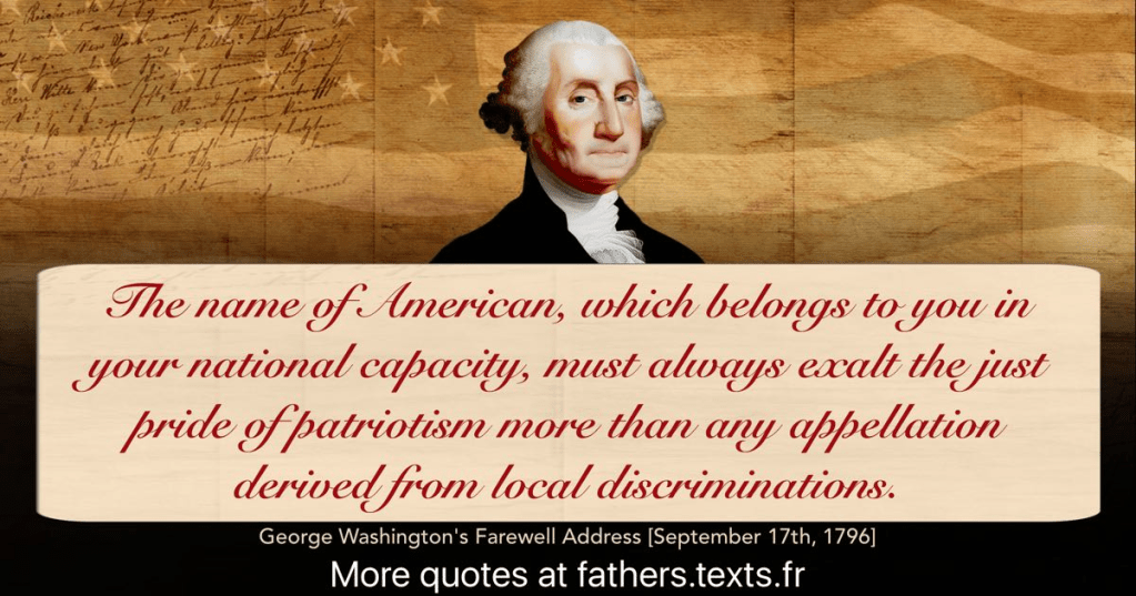 “Citizens by birth or choice of a common country, that country has a right to concentrate your affections. The name of American, which belongs to you, in your national capacity, must always exalt the just pride of Patriotism, more than any appellation derived from local discriminations.” – George Washington (1796)