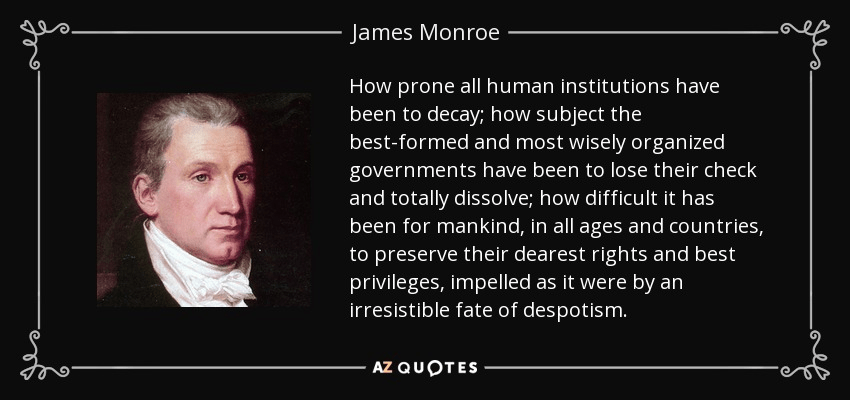 “How prone all human institutions have been to decay; how subject the best-formed and most wisely organized governments have been to lose their check and totally dissolve; how difficult it has been for mankind, in all ages and countries, to preserve their dearest rights and best privileges, impelled as it were by an irresistible fate of despotism.” – James Monroe (1788)