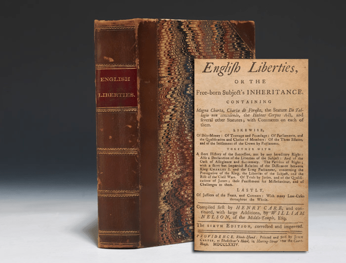 “(E)ach man having a fixed Fundamental Right born with him as to the Freedom of his Person and Property in his Estate, which he cannot be deprived of, but either by his consent, or some Crime for which the Law has Imposed such a Penalty as Forfeiture.” – Henry Care, English Liberties (1680)