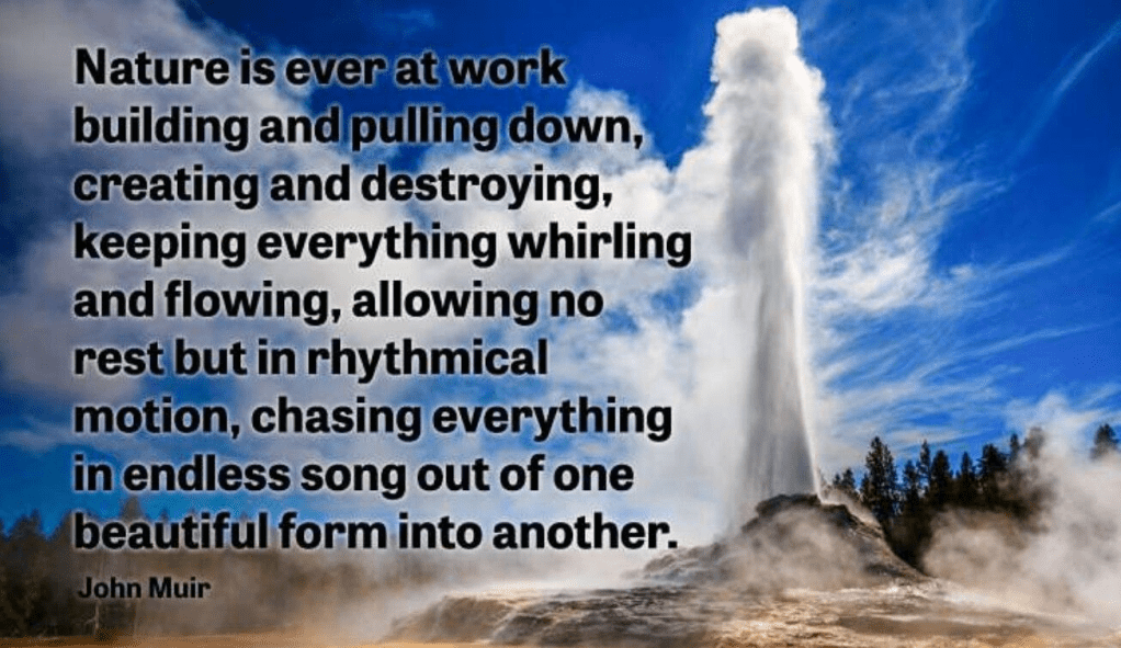 “Nature is ever at work building and pulling down, creating and destroying, keeping everything whirling and flowing, allowing no rest but in rhythmical motion, chasing everything in endless song out of one beautiful form into another.” – John Muir, Naturalist and explorer (1838-1914)