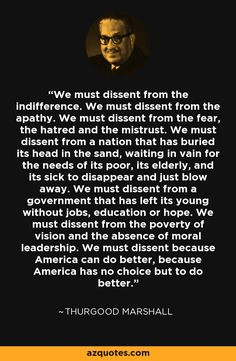 “We must dissent from the fear, the hatred, and the mistrust. We must dissent from a nation that buried its head in the sand waiting in vain for the needs of its poor, its elderly, and its sick to disappear and just blow away. We must dissent from a government that has left its young without jobs, education, or hope. We must dissent from the poverty of vision and timeless absence of moral leadership. We must dissent, because America can do better, because America has no choice but to do better.” -Thurgood Marshall, US Supreme Court Justice (2 Jul 1908-1993)