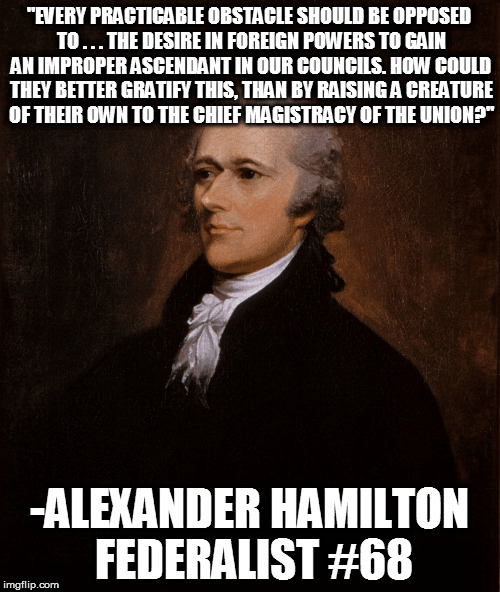 “Nothing was more to be desired than that every practicable obstacle should be opposed to cabal, intrigue, and corruption. These most deadly adversaries of republican government might naturally have been expected to make their approaches from more than one querter, but chiefly from the desire in foreign powers to gain an improper ascendant in our councils. How could they better gratify this, than by raising a creature of their own to the chief magistracy of the Union? But the convention have guarded against all danger of this sort, with the most provident and judicious attention. They have not made the appointment of the President to depend on any preexisting bodies of men, who might be tampered with beforehand to prostitute their votes; but they have referred it in the first instance to an immediate act of the people of America, to be exerted in the choice of persons for the temporary and sole purpose of making the appointment. And they have excluded from eligibility to this trust, all those who from situation might be suspected of too great devotion to the President in office. No senator, representative, or other person holding a place of trust or profit under the United States, can be of the numbers of the electors. Thus without corrupting the body of the people, the immediate agents in the election will at least enter upon the task free from any sinister bias. Their transient existence, and their detached situation, already taken notice of, afford a satisfactory prospect of their continuing so, to the conclusion of it. The business of corruption, when it is to embrace so considerable a number of men, requires time as well as means. Nor would it be found easy suddenly to embark them, dispersed as they would be over thirteen States, in any combinations founded upon motives, which though they could not properly be denominated corrupt, might yet be of a nature to mislead them from their duty.” – Alexander Hamilton, The Federalist Papers, No. 68, “The Mode of Electing the President (March 14, 1788)” speaking on the importance of the Electoral College