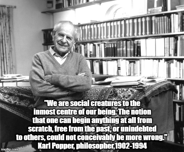 “We are social creatures to the inmost centre of our being. The notion that one can begin anything at all from scratch, free from the past, or unindebted to others, could not conceivably be more wrong.” -Karl Popper, philosopher and professor (28 Jul 1902-1994)
