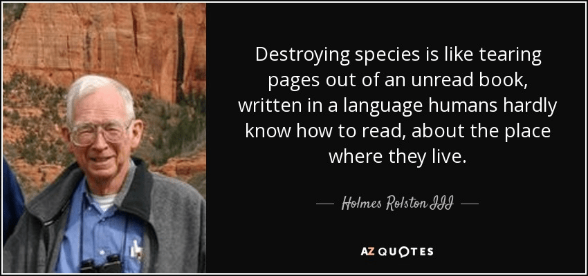 “Destroying species is like tearing pages out of an unread book, written in a language humans hardly know how to read, about the place where they live.” -Holmes Rolston III, professor of philosophy (b. 1932)
