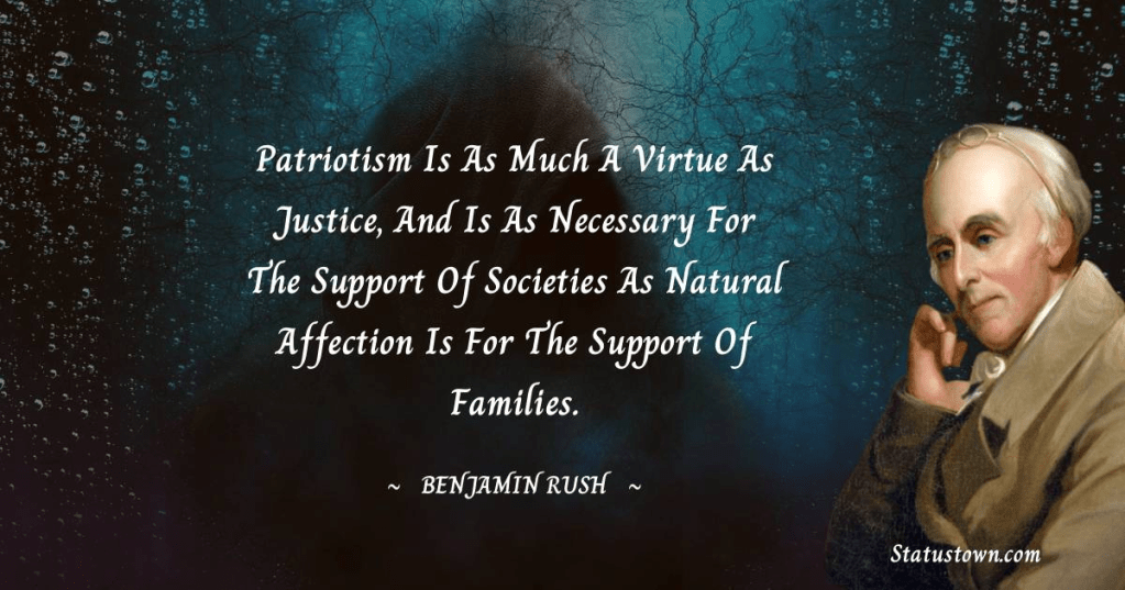“Patriotism is as much a virtue as justice, and is as necessary for the support of societies as natural affection is for the support of families.” – Benjamin Rush (1773)