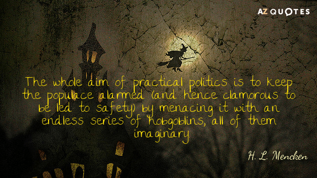 “The whole aim of practical politics is to keep the populace in a continual state of alarm (and hence clamorous to be led to safety) by menacing them with an endless series of hobgoblins, all of them imaginary.” – H. L. Mencken