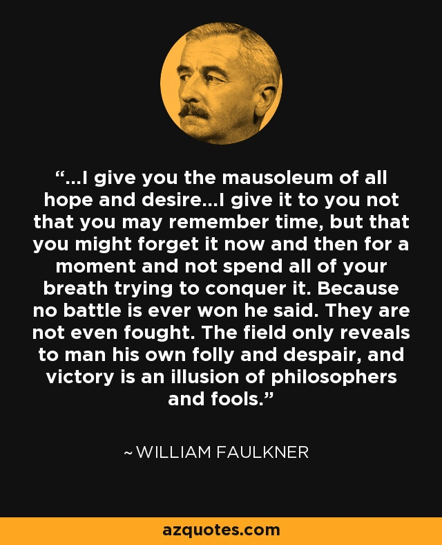 “No battle is ever won he said. They are not even fought. The field only reveals to man his own folly and despair, and victory is an illusion of philosophers and fools.” – William Faulkner, novelist (25 Sep 1897-1962)