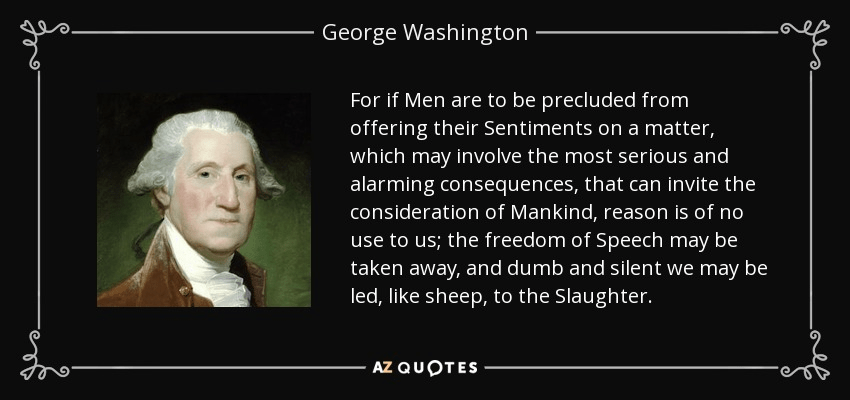[I]f Men are to be precluded from offering their Sentiments on a matter, which may involve the most serious and alarming consequences, that can invite the consideration of Mankind, reason is of no use to us; the freedom of Speech may be taken away, and, dumb and silent we may be led like sheep, to the Slaughter. – George Washington, Speech to the Officers of the Army at Newburgh, the Newburgh Address, March 15, 1783.