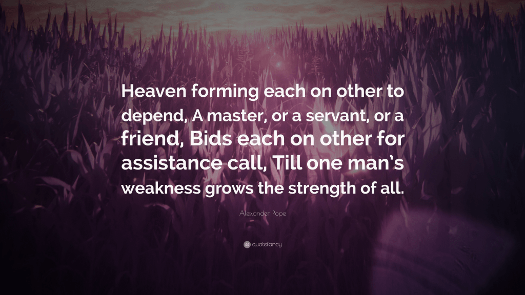 “Heaven, forming each on other to depend, Bids each on other for assistance call, ‘Till one man’s weakness grows the strength of all. Wants, frailties, passions closer still ally The common interest, or endear the tie: To these we owe true friendship, love sincere, Each home-felt joy, that life inherits here.” – James Wilson, Of Man, as a Member of Society, Lectures on Law (1791)