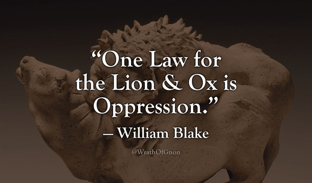 “One law for the lion and ox is oppression.” – William Blake, poet, engraver, and painter (28 Nov 1757-1827)