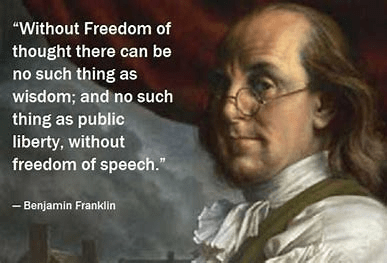 “Without Freedom of Thought there can be no such thing as Wisdom; and no such thing as Public Liberty, without Freedom of Speech; which is the Right of every Man, as far as by it, he does not hurt or control the Right of another: And this is the only Check it ought to suffer, and the only Bounds it ought to know.” – Benjamin Franklin (1722)