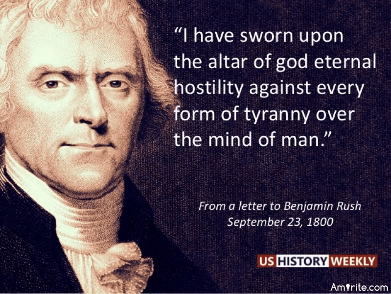 “I have sworn upon the altar of God, eternal hostility against every form of tyranny over the mind of man.” – Thomas Jefferson (1800)