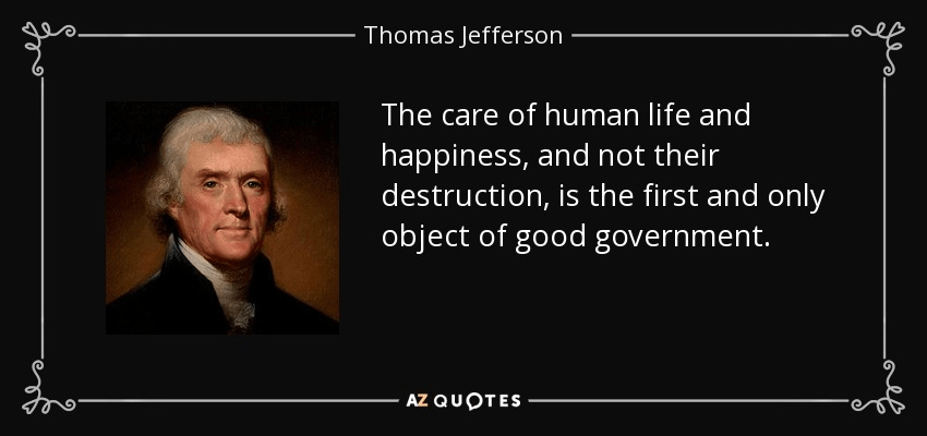 “The care of human life and happiness, and not their destruction, is the first and only legitimate object of good government.” – Thomas Jefferson (1809)