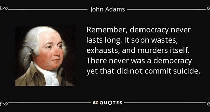 “I might have exhibited as many millions of plebeians sacrificed by the pride, folly, and ambition of their fellow-plebeians and their own, in proportion to the extent and duration of their power. Remember, democracy never lasts long. It soon wastes, exhausts, and murders itself. There never was a democracy yet that did not commit suicide. It is in vain to say that democracy is less vain, less proud, less selfish, less ambitious, or less avaricious than aristocracy or monarchy. It is not true, in fact, and nowhere appears in history. Those passions are the same in all men, under all forms of simple government, and when unchecked, produce the same effects of fraud, violence, and cruelty. When clear prospects are opened before vanity, pride, avarice, or ambition, for their easy gratification, it is hard for the most considerate philosophers and the most conscientious moralists to resist the temptation.” – John Adams